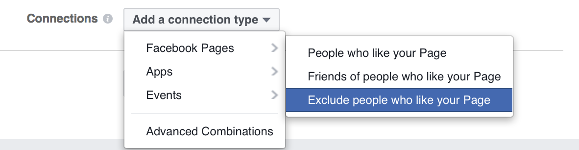 You can also guarantee that your campaigns will only be shown to users who aren’t already following you on social media. To do this, scroll down to “Connections” in the targeting options on your ad campaign. Hover over “Facebook Pages” and select “exclude people who like your Page.”
