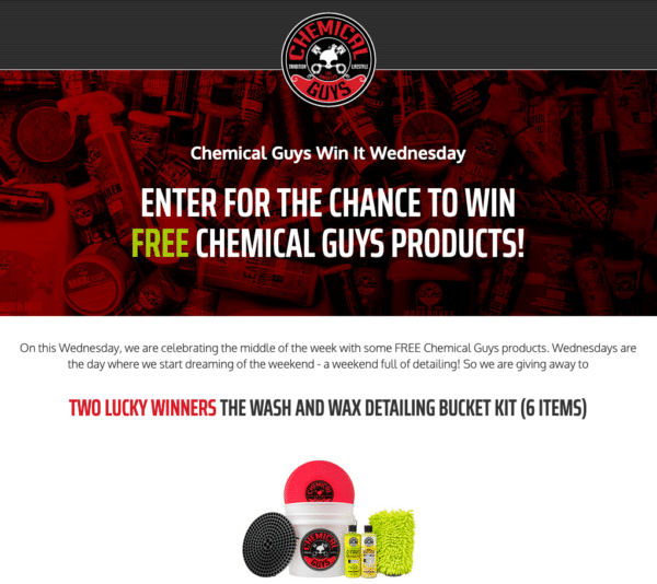 Chemical Guys are giving away their product as a prizeWant to shake things up and give away something that isn’t your own product? Think of a complementary prize. For example, if you sell really awesome car wax and you wanted to go big with your contest, you could give away a car.Wait a minute, a car? Okay, you also want to consider your ROI with the prize you are awarding relative to your goal. If you only expect to collect 100 new email subscribers, and you expect about 30% of those new subscribers to become customers, then maybe a car is too much. However, if you think you’ll be getting 100,000 new subscribers, then maybe a car isn’t such a big deal.