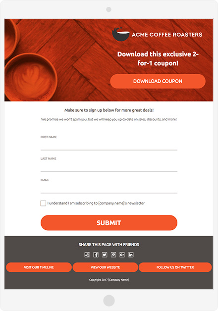 Want to keep things simple? Try a campaign where folks can just click a button and *BOOM* they have downloaded your coupon. With our Coupon template, there are no barriers to receiving the coupon, just a button on a page. Removing the requirement to submit a form increases the chances that folks will download the coupon, and gets the coupon into the hands of more people. This can be a decent strategy if your goal is to increase the number of customers coming through your door on Black Friday. Plus, there is still a chance for you to collect a bit of data from potential customers. The Coupon template includes a form for users to fill out if they are interested in receiving coupons in the future. Use the Coupon template for this Black Friday campaign.