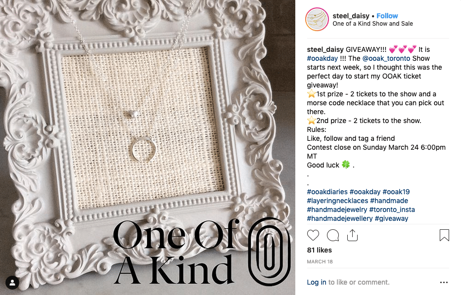 This giveaway is offering tickets to a OOAK Show (One of a Kind) as well as a OOAK necklace from this business’ booth. Those who enter are interested in the wares this business has to offer, making them prime candidates to visit your store or booth and make a purchase.