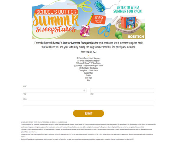 With school letting out for the summer, parents are looking for ways to keep their kiddos occupied for the next few months. Bostitch’s "School's Out for Summer Sweepstakes" campaign definitely deserves an A+. Not only did they create an awesome prize pack both kids and parents will love, but their entry form only takes a few seconds to fill out because its consists of two fields, name and email address. A great reminder to keep things simple.