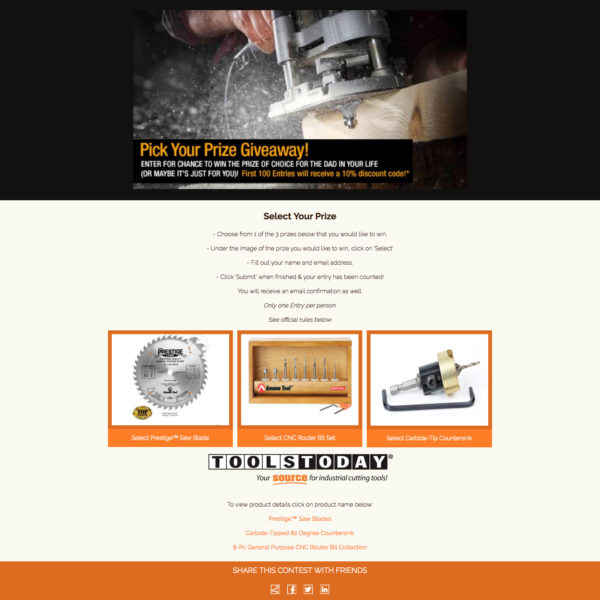 Father’s Day is Sunday; have you created a campaign yet? It’s not too late! Check out ToolsToday’s Father’s Day Pick Your Prize contest. Folks are encouraged to choose a gift they’d like to win for a dad in their life, or the prize they want for themselves. They also use our email autoresponder feature to send an entry confirmation via email, with the first 100 entrants receiving a little bonus of a 10% discount.