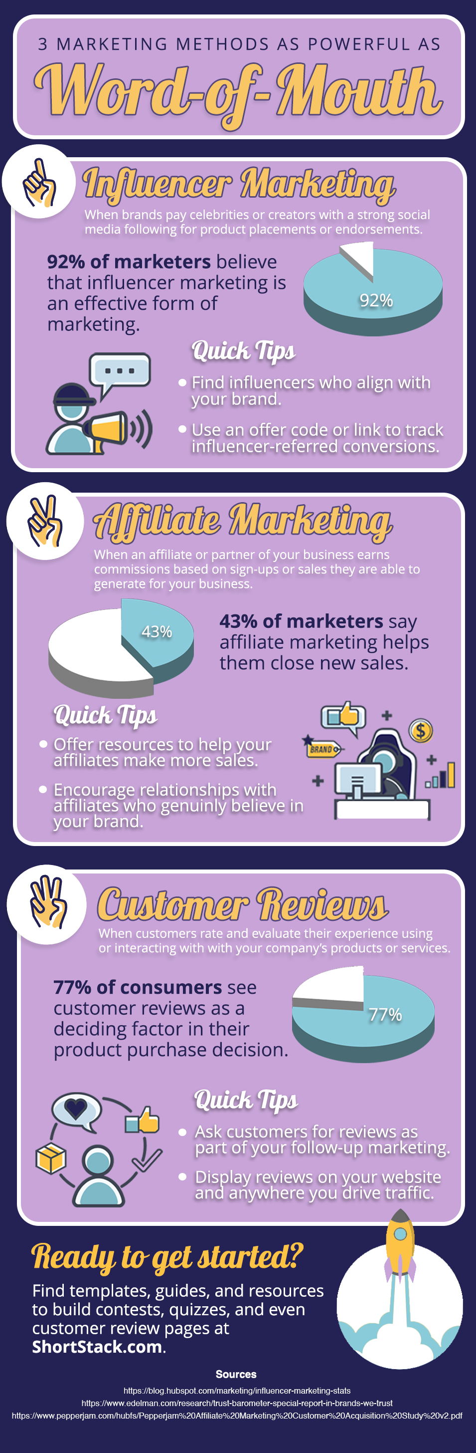 In this infographic, learn more about influencer marketing and affiliate marketing, as well as utilizing customer reviews to mimic the impact of word-of-mouth exchanges and ultimately boost sales for your brand.