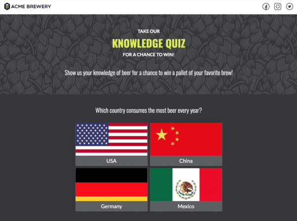 People enjoy being challenged. A knowledge or trivia quiz appeals to folks who want their smarts tested, and it increases the time they spend interacting with your brand. Be sure to ask questions that relate to your business or products. For example, a sports shoe company might ask folks to choose the shoe made for basketball, then show four examples of their products as potential answers. After all of the questions have been answered, ask quiz takers to submit their email address to learn their score and to enter your giveaway. In addition to providing their outcome, invite participants to share the quiz with friends to see if they can match or beat their score.