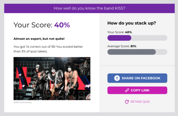 Self-proclaimed fans love a way to quantify their loyalty, and there’s no better way to do that than with a test of knowledge. One way to keep concert-goers engaged is with digital marketing in the form of an online quiz. Build a quiz that includes questions related to the performance itself, or just to the artist. Either way, a quiz will be hard to pass up. I’m obviously not a member of the KISS fan army.