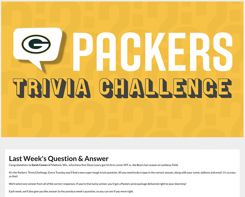 A great way to educate your audience about your business or industry is with a trivia quiz. Asking a weekly trivia question and entering all who answered correctly into a drawing can help keep current and future customers coming back to your website or landing page, which in turn, keeps your business on the forefront of their minds.Check out this example from the Greenbay Packers. A simple entry form collects participant info while keeping fans engaged and coming back week after week to see if they’ve won.