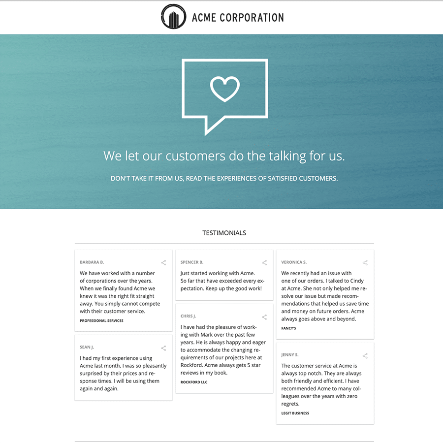 Building up your reputation through reviews has other benefits as well. Whereas hashtagged posts typically live on a social media channel, you can promote reviews anywhere. Add quotes from reviews to a website, landing page, ads, promotional videos, or anywhere your promote your business. Reviews can even be grouped together and displayed in a gallery for additional impact.View and Create Your Own Review Gallery