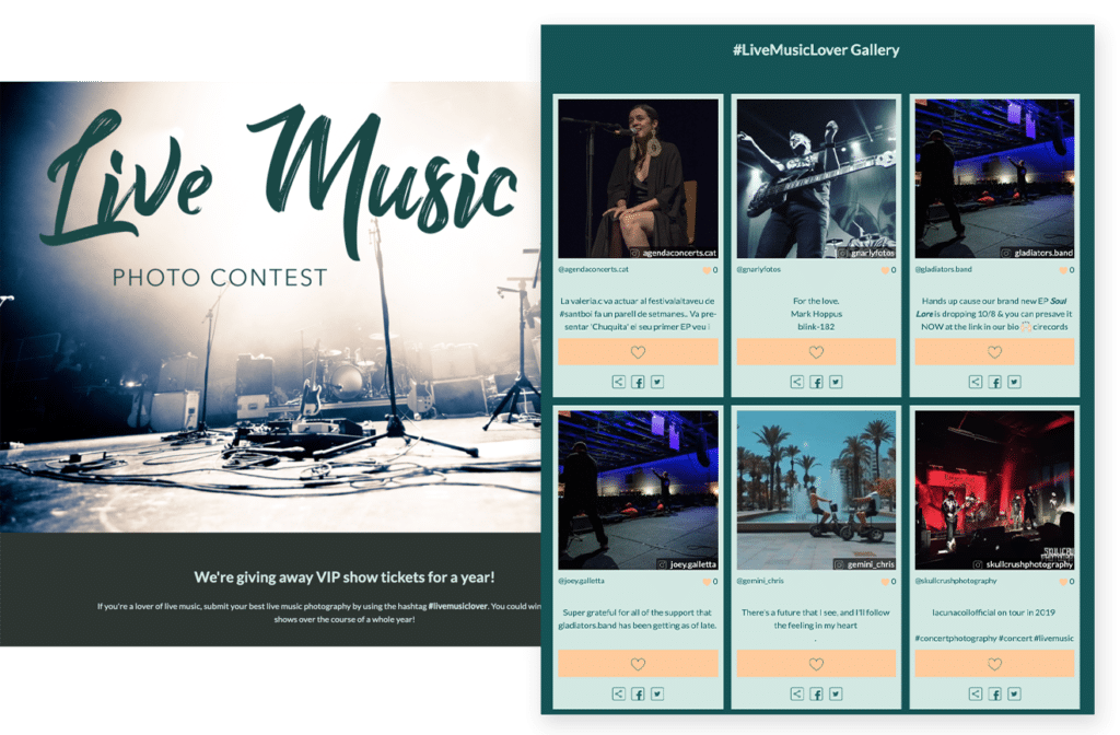 Concerts are great backdrops for Instagram content, so why not encourage patrons to use your venue’s hashtag when posting? By doing so, you’ll be left with a stream of valuable user-generated content that can be used for further venue promotion. (With permission, of course.)To create your hashtag, think of something unique that won’t capture a ton of arbitrary posts. For example, you can incorporate the name of your venue, the city it’s in, or whatever will make something clever and memorable such as #MemoriesAtTheMet or #RockingRadioCity.To encourage the use of a hashtag, create a contest or giveaway from the content you collect. Build a hashtag feed that will import all hashtagged posts into a list of entries. You can choose a winner at random or display all of the collected posts in a gallery and enable voting. Creating a feed of hashtagged posts as well as building a landing page to display voting-enabled entries are possible with contest software such as ShortStack.