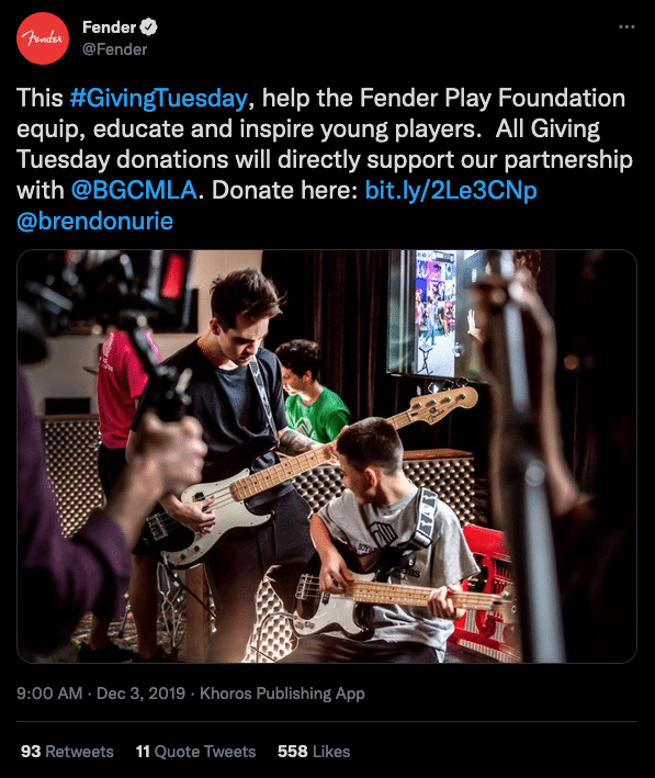 Fender, the company probably best known for its guitars and amps, chose to promote their Fender Play Foundation for Giving Tuesday 2020. The Fender Play Foundation’s mission is to equip young people with stringed instruments (mainly guitars), then educate and inspire them to play. They used Twitter to announce that all Giving Tuesday donations would benefit the Boys and Girls Club of Los Angeles.