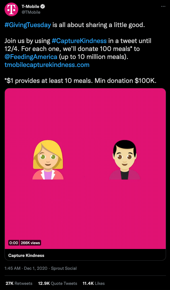 T-Mobile chose Feeding America as their charity of choice for Giving Tuesday. They pledged to donate 100 meals for every tweet that included the hashtag #CaptureKindness. T-Mobile pledged to donate a minimum of $100K. For every $1 donated, Feeding America could provide 10 meals.