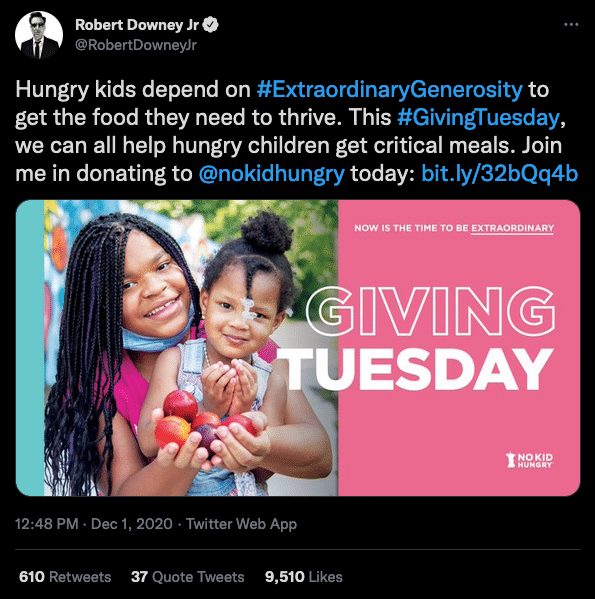 A little star power can go a long way when promoting a charity, and Robert Downey Jr. knows this. He chose to support No Kid Hungry by tweeting that he would be donating to it for Giving Tuesday 2020. Along with announcing his intention to donate, he encouraged his followers to do so as well. Tweeting to his audience of 16.6 million followers is great brand awareness for No Kid Hungry, and seeing one of their favorite actors support a cause likely encouraged a number of fans to donate to the cause.