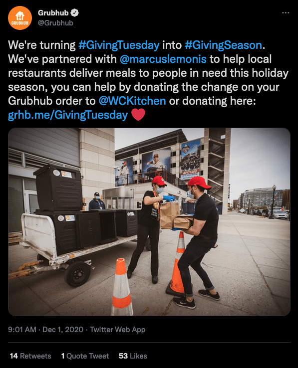 Grubhub is an online food ordering and delivery service, so it’s only natural they would team up with organizations focused on alleviating food insecurity. Grubhub tweeted about the “Plating Change” partnership with World Central Kitchen and Marcus Lemonis. For this partnership, Marcus Lemonis purchased from independent restaurants and Grubhub delivered those meals to food-insecure communities. Grubhub users were also given the opportunity to get involved by rounding up their order totals and donating the extra money to World Central Kitchen to purchase meals for someone in need.
