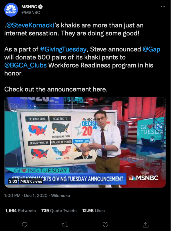 #GivingTuesday Tweet from MSNBC, Gap and Boys and Girls ClubMSNBC’s Steve Kornacki was a big deal in 2020. He’s not only known for the enthusiastic and informative election coverage he provided for days on end, but also for wearing Gap khakis. As a fun Giving Tuesday twist, Steve Kornacki announced that Gap was donating 500 pairs of khakis to the Boys and Girls Club.
