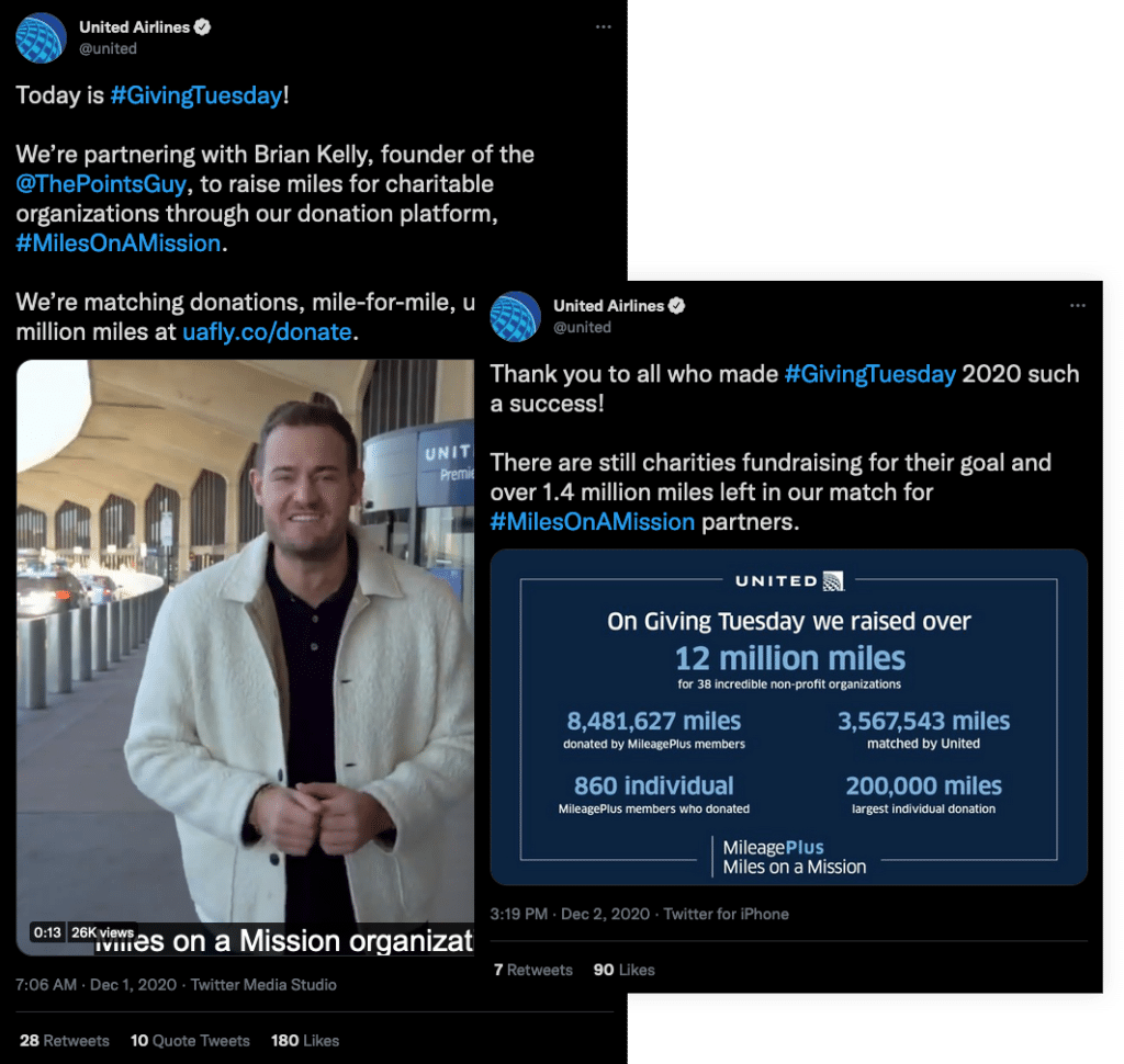 United Airlines used Giving Tuesday to promote its Miles on a Mission program. Miles on a Mission allows United’s MileagePlus members to donate the miles to a wide variety of charities. To raise awareness for their campaign, United teamed up with Brian Kelly, founder of The Points Guy, a well-known blog for travelers. On Giving Tuesday, United pledged to match members’ donations of up to 5 million miles. Miles weren’t only used for travel, they were also used to provide monetary donations to organizations. Many of the organizations met their goals for Giving Tuesday, making this campaign a success.