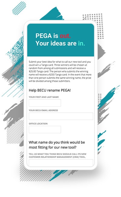 Naming contests inspire a sense of product “ownership” for the person who wins. Plus, they are a smart idea for collecting creative names. BECU had a clever idea with their PEGA naming contest. Their contest solicited names from their employees for their new PEGA tool. The winner not only gets recognition for submitting the best name, but they also win a $250 gift card.