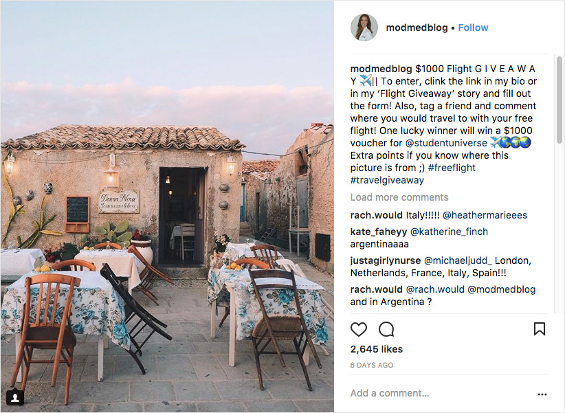 Contests, by design, encourage connection with your brands and your products. The use of common hashtags in a contest such as #Instagramcontest or even #contest will attract those searching broadly and encourage sharing but you'll also want to include hashtags that are unique to your giveaway, like #travelgivaway. Hashtags unique to your business can improve brand awareness and build a community of followers interested in, and more loyal to, your brand.