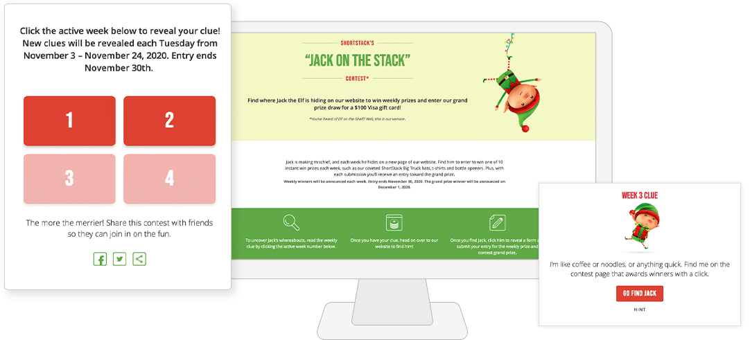 ShortStack's Jack on the Stack Contest[button size='medium' style='white' text='Build Your Own' icon='' icon_color='' link='https://www.shortstack.com/blog/how-to-create-your-own-elf-on-the-shelf-contest-this-holiday-season/' target='_blank' color='' hover_color='' border_color='' hover_border_color='' background_color='' hover_background_color='' font_style='' font_weight='' text_align='' margin='0 0 10px']A new clue was revealed once every week over the course of four weeks. Each clue led to Jack who was hiding somewhere on our website. When participants found him and clicked on him, an entry form was revealed that also happened to offer an instant win giveaway.Each week, multiple winners were selected instantly, and all were entered to win the grand prize that would be announced after the 4-week giveaway was over. This meant that if participants entered every week, they’d have four chances at winning the grand prize.To create a scavenger hunt giveaway for your business, you could tweak any component of it to fit your goals. You could run the giveaway for longer, shorter, offer a new clue every day instead of every week, or remove the instant win component and do a traditional drawing instead.