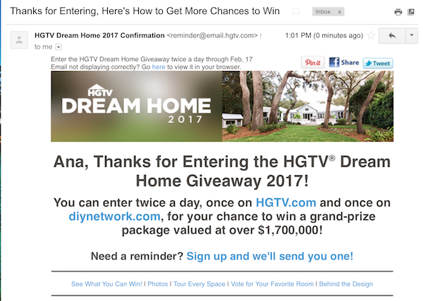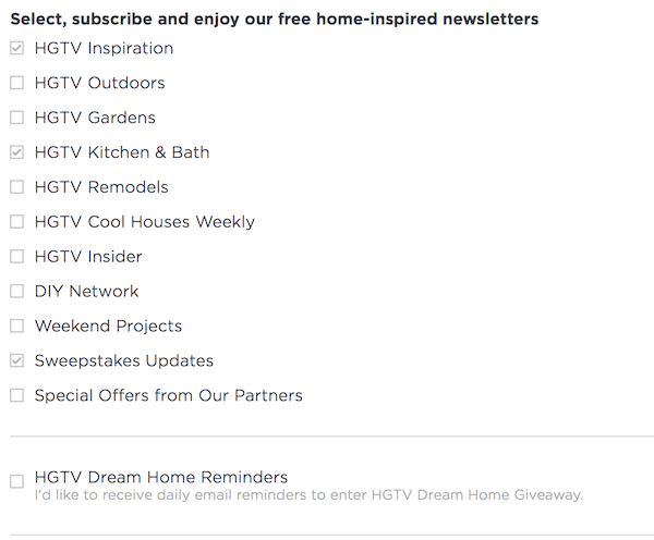 While most contests stick to asking for engagement and an email address, some ask for additional information. I’ve seen contests that ask “how can we help you,” or what products or services most interest users. HGTV’s Dream Home Giveaway Contest, for example, gives users the option to select which niche-specific newsletters they’d like to sign up to.