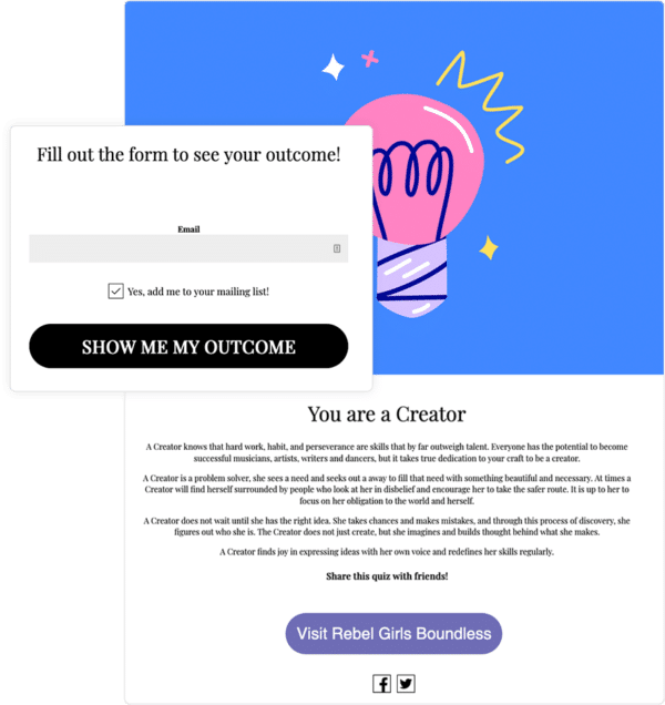 One of the best examples we’ve seen of a company that kept the conversation going through the data they collected is Timbuktu Labs, Inc, an indie publisher of books and digital media with a mission to empower young girls. Timbuktu Labs used a personality quiz to help promote their new digital magazine, Rebel Girls Boundless. The quiz came with five questions and the outcome helped quiz participants to “discover what kind of rebel girl you are.” Timbuktu labs felt a personality quiz would be the perfect way to drive engagement for their new publication. According to its creator, “We wanted our customers and future customers to feel like they’re engaging in a fun activity instead of a promotional push.” Although the promotion did not offer a prize, Timbuktu Labs was confident that this promotion would be a success, because, well... everyone loves a quiz! And they were right - around 100 leads were collected each day, for a total of 3,047 leads. These leads were used to build up the company’s subscriber list. This list is sent updates on new articles, Rebel Girls Boundless announcements, and occasionally receives additional Rebel Girls content, including promotions, contests, product releases, and other Rebel Girls announcements.Getting creative with your promotions and contests can lead to invaluable conversations with your audience.