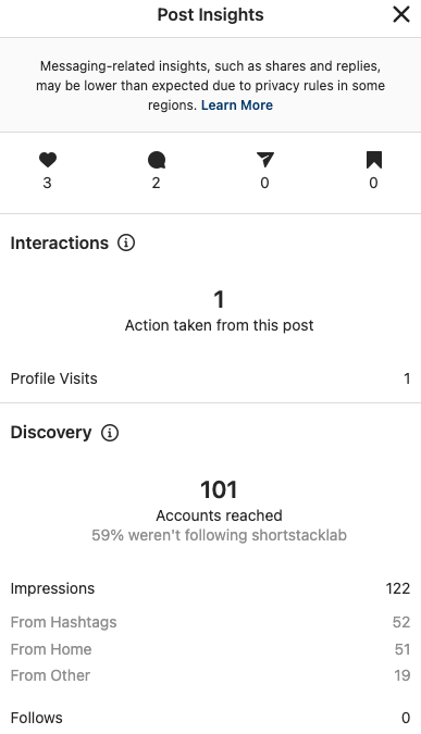 As you can see, this post reached 59% of audience members that are not currently following our Instagram page. We also received a few likes and comments, which boosted my ego. ;)