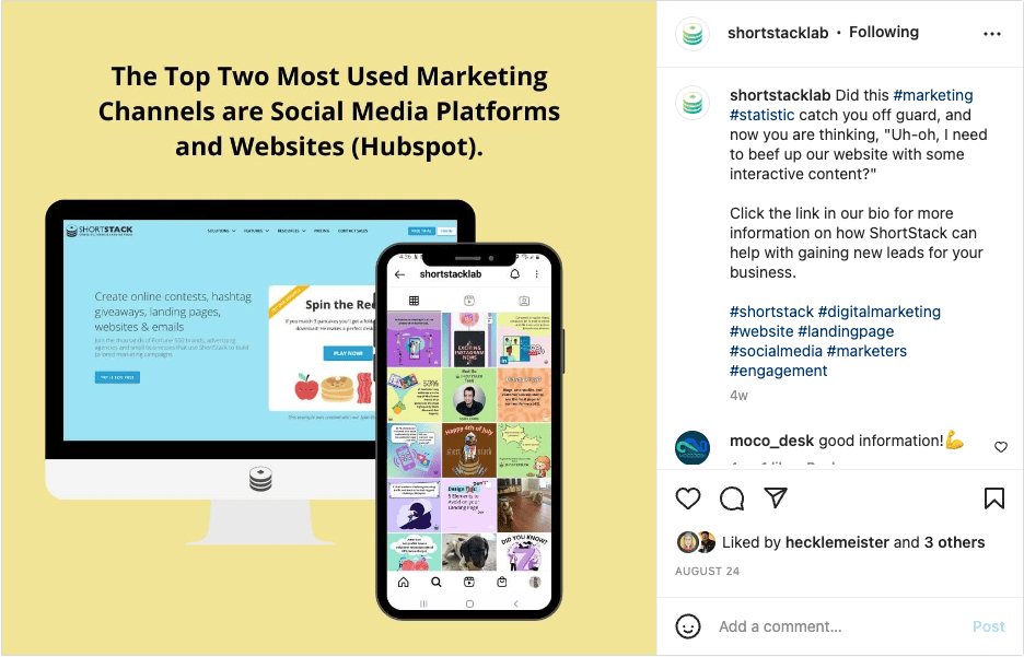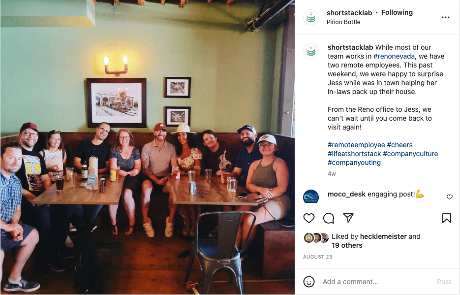 The best engagement we receive on Instagram is when I post about the team. When it is a picture of coworkers wearing matching outfits or our office pups chilling next to us, Instagram is all about showing your humanness. Showcase who you are as a company, not what you are.