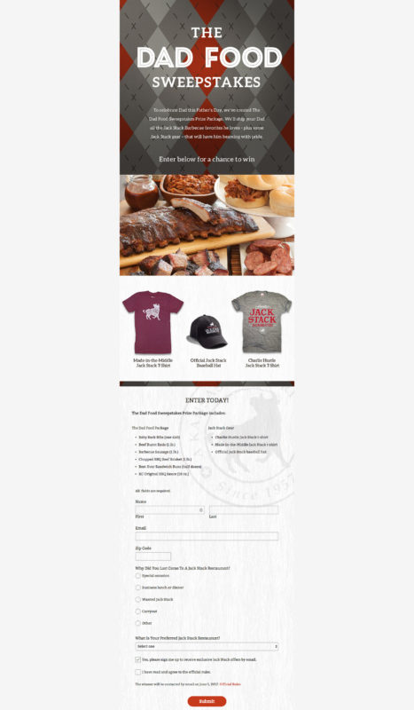 Father’s Day is still a few weeks away, but why not start your campaign now? Jack Stack’s “Dad Food” sweepstakes will definitely get your creative juices flowing and your mouth watering! Jack Stack has created a prize pack any (meat-eating) dad would LOVE, while at the same time collecting valuable information about their customers. Plus, they boost the incentive for entrants to spread the word about the campaign using our refer-a-friend template features. IDEA: Give people the opportunity to earn extra entries or points for providing extra information by using our points per field feature.