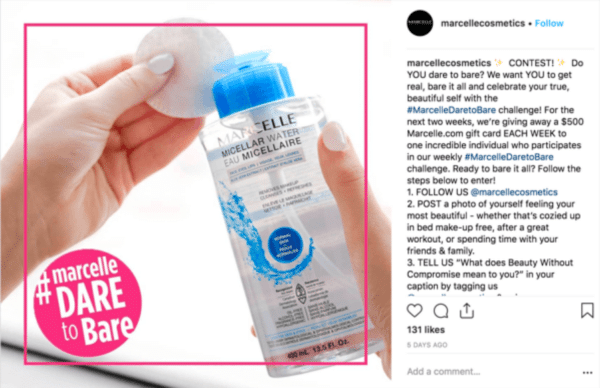 Image Source: Marcelle Cosmetics[/caption]A great way to do this on social platforms is in the form of giveaways. As demonstrated above, creating a giveaway post that encourages people to share your content for a chance to win a product is a great way to increase word of mouth and in turn brand awareness.