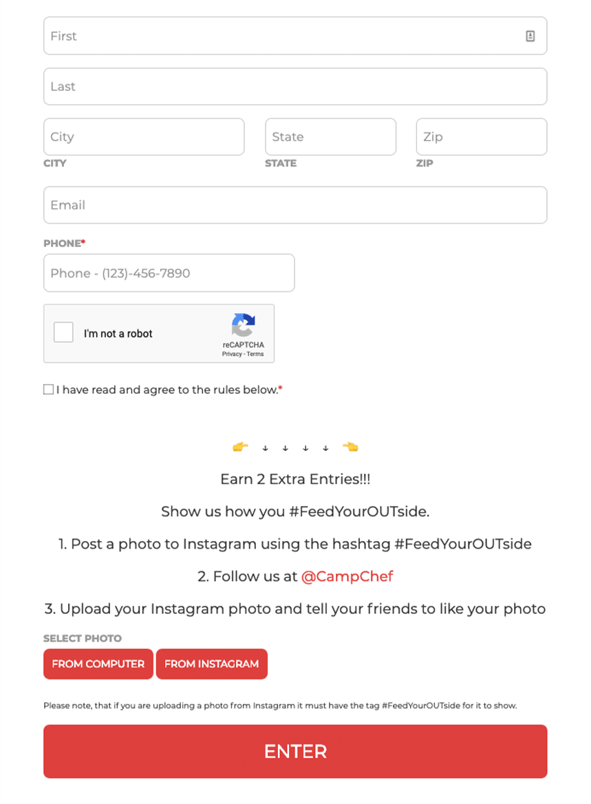 Camp Chef embedded the ShortStack campaigns on their website. This allowed them to use a Camp Chef branded URL for the contest. Plus, sending people to your website increases the chances of customers shopping around a bit after entering the sweepstakes. Embedding also had the benefit of using a single URL for the duration of the campaign, despite using multiple ShortStack campaigns.