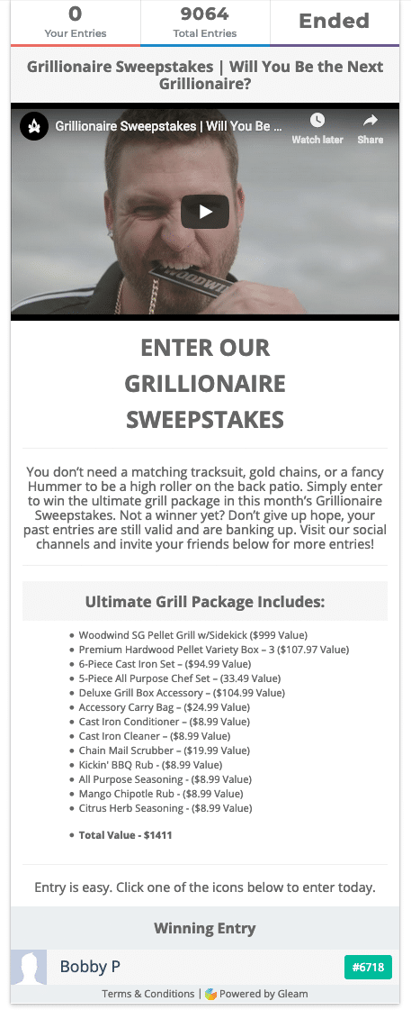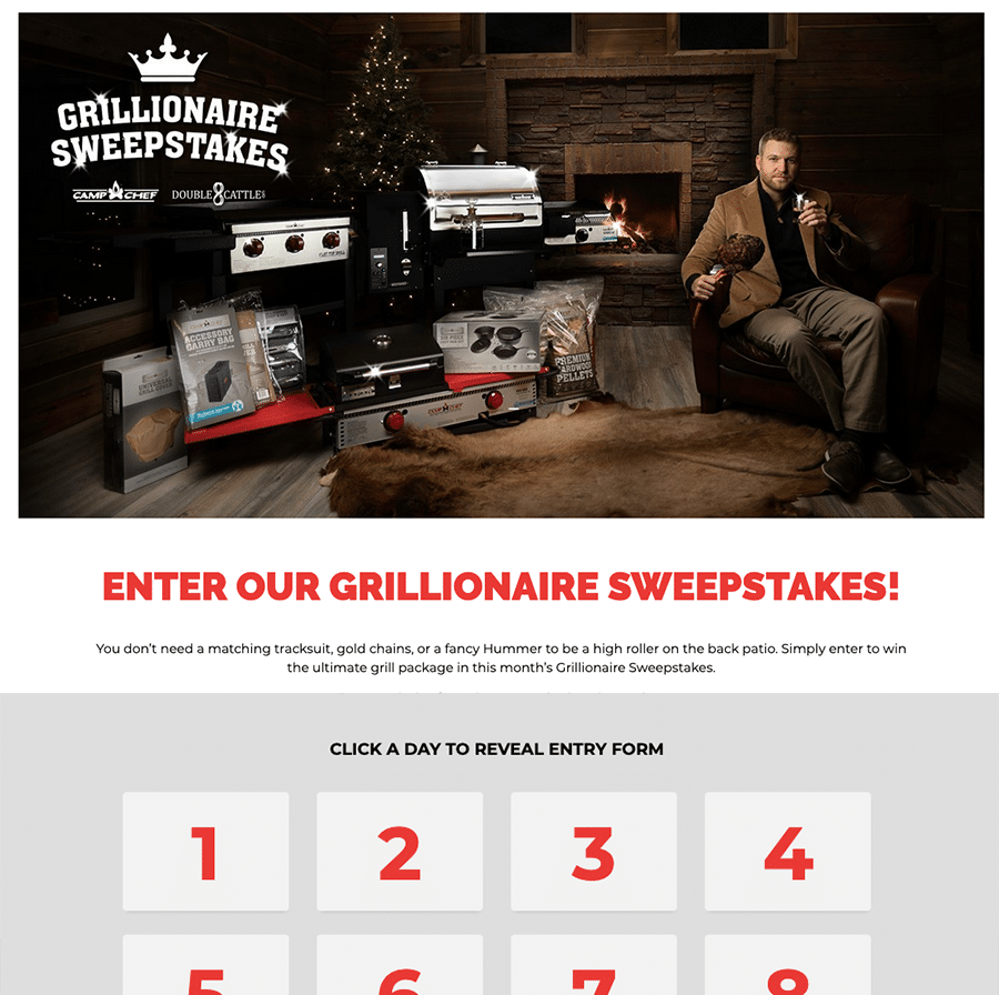 Camp Chef created their “Will You be the Next Grillionaire?” sweepstakes to collect leads for their email marketing list. What’s a grillionaire? Someone who is rich in grilling gear of course! From August through December 2018, people could enter to win that month’s Grillionaire prize pack. For example, December’s prize pack included: