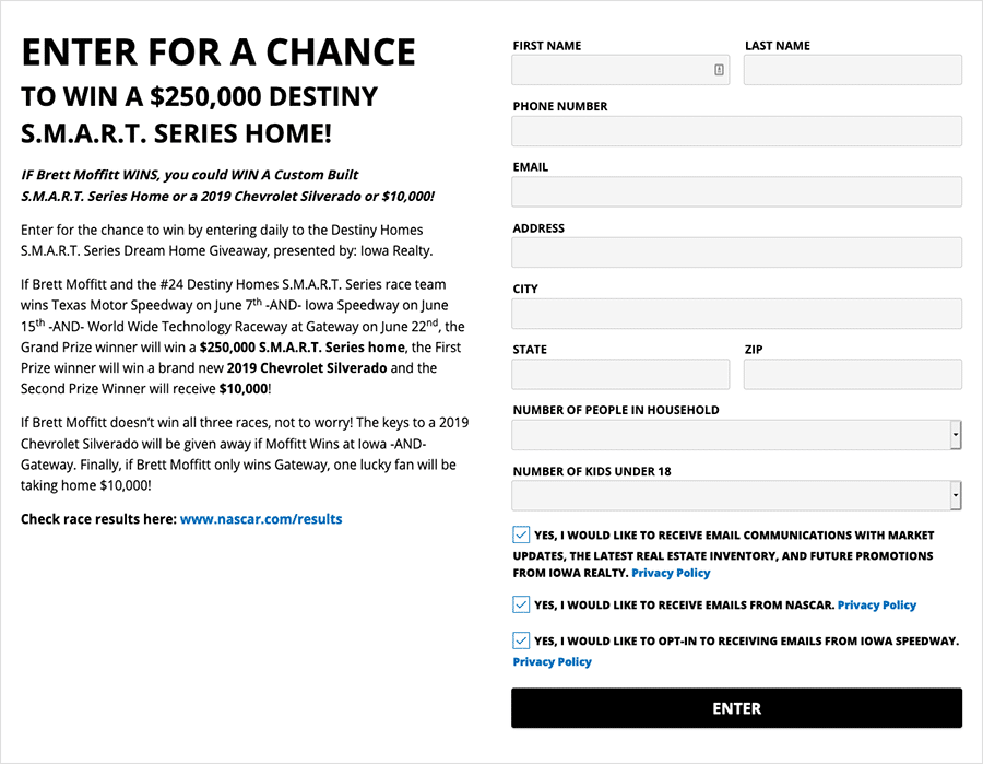 Race(s)Grand PrizeFirst PrizeSecond PrizeTexas Motor Speedway on June 7th, Iowa Speedway on June 15th and World Wide Technology Raceway at Gateway on June 22nd$250,000 S.M.A.R.T. Series home;2019 Chevrolet Silverado$10,000Iowa Speedway and World Wide Technology Raceway at Gateway2019 Chevrolet Silverado$10,000World Wide Technology Raceway at Gateway$10,000To enter, people simply visited the contest landing page and filled out the entry form. At that time, they could choose to opt-in to email communications from Iowa Realty, NASCAR and Iowa Speedway. These opt-ins help create qualified leads for each organization. If someone checked the Iowa Realty box, then it’s likely they were interested in buying or selling a home in the near future. If the NASCAR or Iowa Speedway boxes were checked, then the entrant is likely a racing fan.