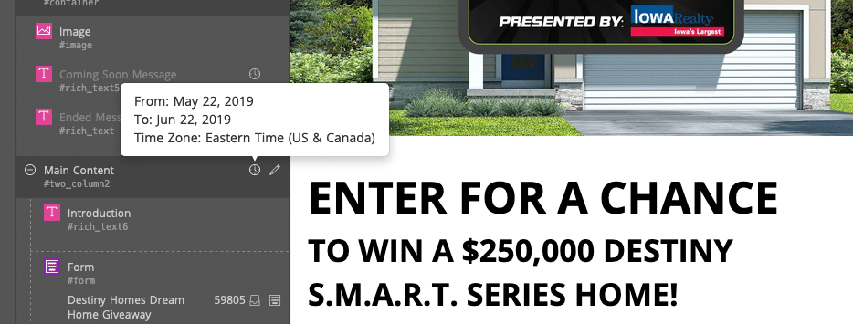 Autoresponder email for the Destiny Homes S.M.A.R.T Series Dream Home GiveawayTime-based visibility settings were implemented to start showing the contest entry form at 00:00 on May 22, 2019 and stop showing it at 23:59 on June 21, 2019. Implementing these settings ensured that entries only came in during the time period outlined in the contest rules without the contest administrator staying up or getting out of bed to manually change the settings.