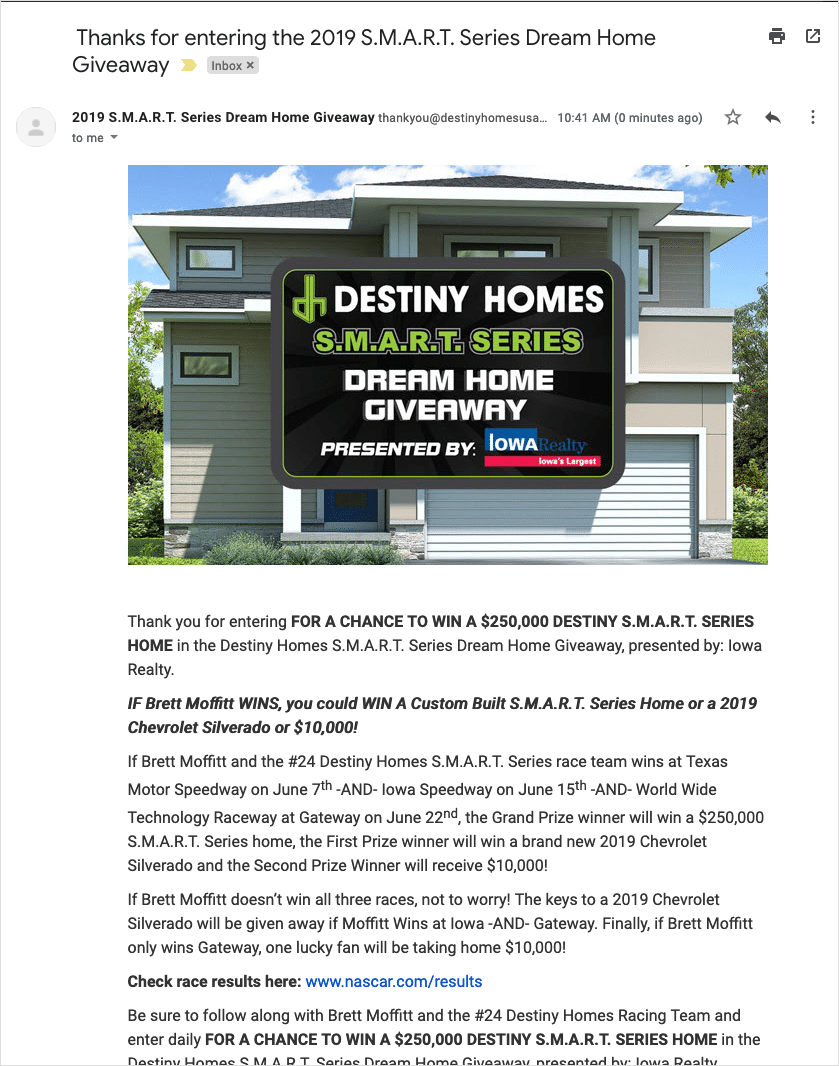 Beyond basic contact information like name and email address, the entry form contained some additional questions that would help marketing teams learn more about potential leads. Entrants were asked for their physical address, the number of people in their household and the number of kids under the age of 18. The contest was open to people in all states (except Florida and New York) so the physical address can help to further qualify potential leads for both Iowa Realty and Iowa Speedway. Plus, asking for the number of members in a household can inform Destiny Homes and Iowa Realty about the type of home folks might be interested in.After form submission, a thank you message displayed, encouraging folks to share the contest with friends. An autoresponder was also sent, containing valuable contest information and links to help entrants follow along with race results.