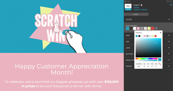 Using ShortStack's swatches allows you to quickly apply color changes to your landing pageWhen you start applying your color scheme to your landing page, set up the colors from your color palette as swatches. Then, just choose one of those swatches instead of typing in the Hex code for a color when styling different elements of the landing page. If you need to adjust a color within your palette, you can change the color of that swatch, and all elements you assigned to use that swatch will automatically be updated to the new color.