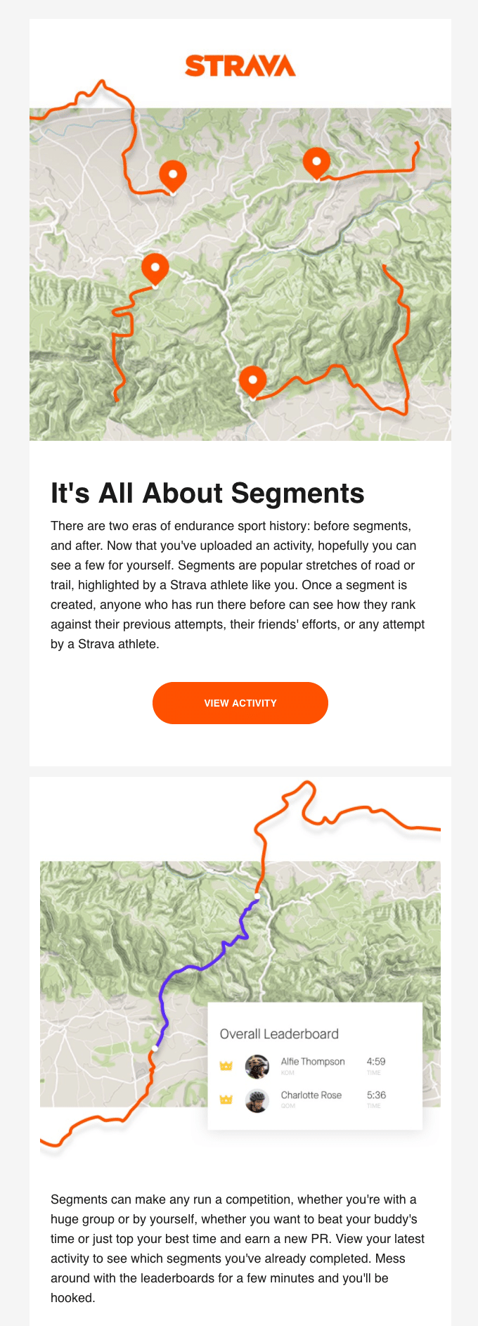 Strava is an app for runners and cyclists that uses GPS data to track workouts, provide insights into your performance, and allows you to connect with like-minded fitness enthusiasts around the world.The thing that ties together Strava’s community of users is data. Whether it’s personalized data about speed, distance, and performance. Or visualized data mapping out popular running or cycling tracks. Data is at the heart of everything they do. Tracking and improving fitness performance backed by real numbers is why this app is so addictive and successful.Strava’s email marketing strategy emphasizes the importance of data to its community. For example, as a Strava user, you receive a monthly status update to show how active you’ve been: