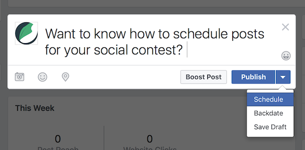 Timing can make a world of difference, and intentionally spacing out the posts promoting your contest can help you get the best results. Plan on having some content to go out at your peak morning hours, and the next day’s post to go live during your peak evening hours.The ability to upload posts ahead of time.