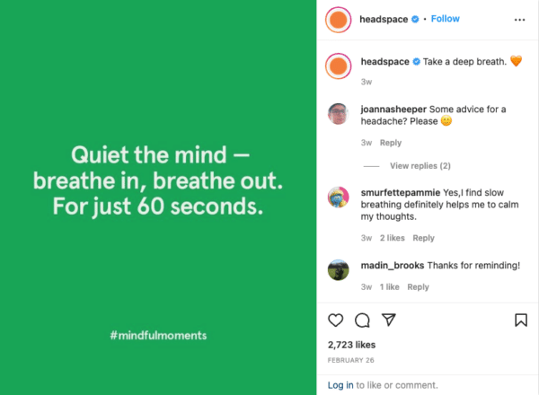 Headspace is a meditation app used by over 30 million people around the world. It provides meditation and mindfulness exercises to clear your mind of stress and improve overall mental health.Headspace’s Instagram presence is a reflection of their app. Followers are given reminders to breathe, to relax, to take mental breaks, and to clear their minds. These reminders use soothing colors and simple text to help the reader slow down. No before and after pictures, no photo contests, no big $10k giveaway – just a relaxing vibe for people to clear their minds for maximum productivity and happiness. Essentially, Headspace’s Instagram profile provides followers a glimpse of some of the meditation and mindfulness techniques they would experience with their paid app. Followers find value in the ability to try these techniques for free. Oh, and the few minutes for a mental break the Headspace posts promote is a major added benefit. What’s not to like about that?How could you incorporate a similar “trial” of your service into your wellness page?Try a live feed of a meditation session or yoga practice on Instagram. This can bring people in and encourage them to join for the next round. Make it a weekly event to build that strong bond with your followers. Building a strong bond and providing a sneak peek at what your service can provide your customers will bring your business big results and provide people with a huge incentive to follow your business. Be a constant reminder and resource for those that need it.