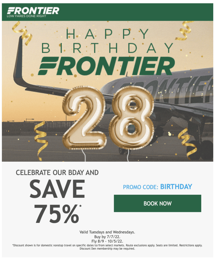 In July 2022, Frontier Airlines turned 28 years old. “For Frontier’s 28th birthday, we wanted to give 28 (how old we turned!) of our loyal customers the gift of a free round trip flight,” shared McWorther.