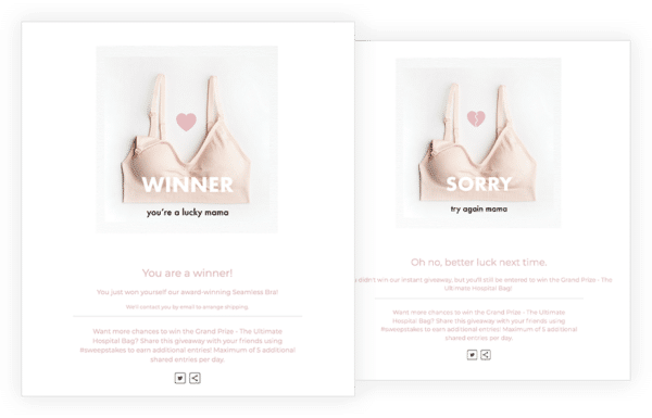 For their Ultimate Hospital Bag Sweepstakes, Motherhood Maternity chose to run an instant win giveaway contest. With this contest, expectant mothers entered for the chance to win the grand prize, valued at $550, and at the same time, they were entered into an instant win drawing for a daily prize, which was the brand's Seamless Maternity and Nursing Bra.Entrants could enter once per day. By allowing entrants to enter once every day, repeat visits increased the entrant’s chances of winning the grand prize, plus they were also eligible to win a daily instant win prize each time they entered.Using ShortStack’s instant win feature allowed Motherhood Maternity to simply enter a number of instant winners and the date range for the contest. The instant win algorithm then awarded prizes over the 31-day period. All of the entrants were collected into a single list for Motherhood Maternity to select a single grand prize winner.