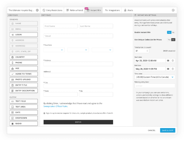 Instant Win settings in ShortStackWith their entry form, Motherhood Maternity collected name, email address, due date and physical address. Entrants were also given the opportunity to sign up for emails fromMotherhood Maternity and their partners. Given the target market, you can bet a lot of participants checked that box.Finally, to make sure the form closed at the right time and nobody could submit entries after the contest period ended, Motherhood Maternity used our time-based visibility settings. This way, nobody on their team had to stay up until midnight on a weekend to close the contest manually.