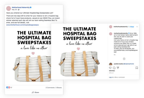 Motherhood Maternity’s Ultimate Hospital Bag Sweepstakes ran from April 29 to May 29, 2020. They promoted it on their website, as well as their Instagram and Facebook channels. The grand prize consisted of a hospital bag full of goodies every mom would love to have with her at the hospital for delivery: