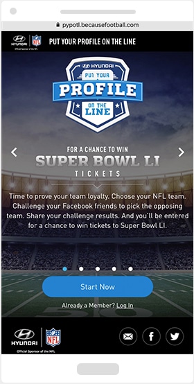 Hyundai knows we love to win – as often as we can. Their ‘Put Your Profile on the Line’ campaign built on the company’s sponsorship of the NFL by giving fans the opportunity to challenge their friends to NFL weekly matchups with their Facebook profile as the wager.Winners could gleefully enjoy seeing their losing friend’s Facebook profile redecorated in the winning team colors. But not all was lost – all players were entered into a contest for Super Bowl tickets.Results proved Hyundai knows us well. The campaign reached 6.4 million people, generated a 27% gain in Facebook favorability, and a recall rate of 47% among Facebook users. The campaign helped brand linkage grow +40%Weekly engagement. Great recall. Positive brand association. Effectiveness is on point.