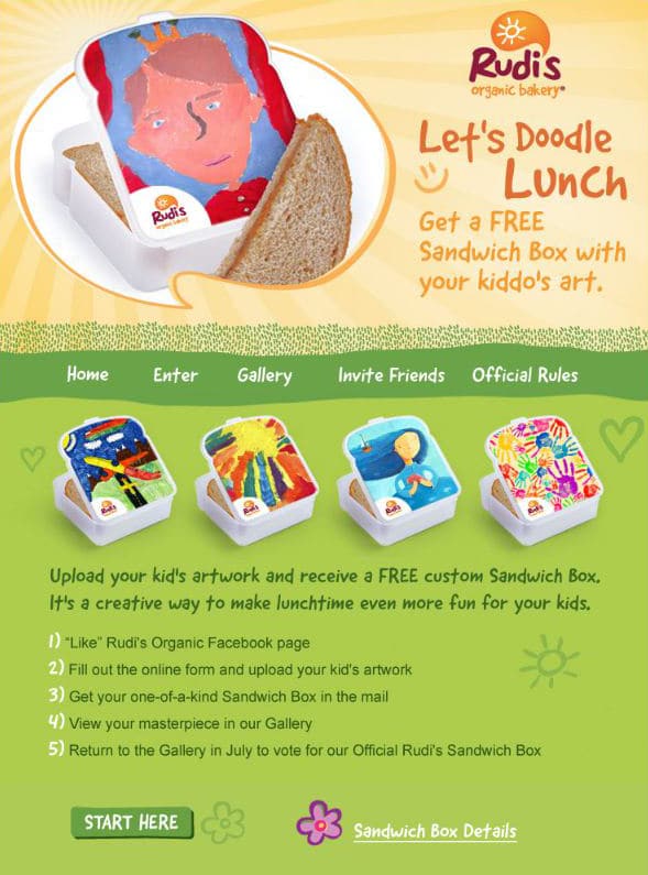 Rudi’s Organic Bakery’s ‘Let’s Doodle Lunch’ Facebook campaignRudi’s Organic Bakery’s ‘Let’s Doodle Lunch’ Facebook campaign recognized the brand’s role in supporting family health and linked it to families’ love for kids. Parents could upload children’s artwork, get a coupon for new Flatz bread and a free sandwich box showcasing the child’s art.When the campaign launched, Rudi’s had fewer than 20,000 likes, but 17,000 entries later, the brand generated more than 23,000 impressions and click-throughs, saw their Facebook fan base double, and met the bakery's $10 million-dollar quarterly sales goal.