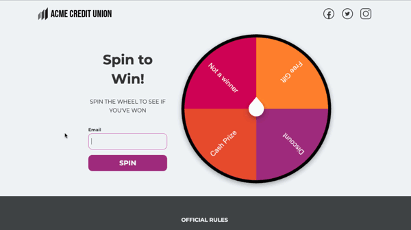 Adding gamified elements can be as simple as having the user spin a wheel or virtually scratch off an image to reveal a prize. Building these types of marketing campaigns is easier than you think. Some products on the market allow you to set this up without the help of a developer. In the list below, I’ve included examples of simple gamified giveaways, gamified instant win giveaways, and a few quizzes. These examples were built with the contest and giveaway platform ShortStack. Each example is linked to a template to help you get started.