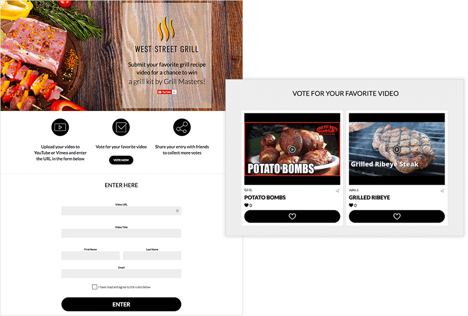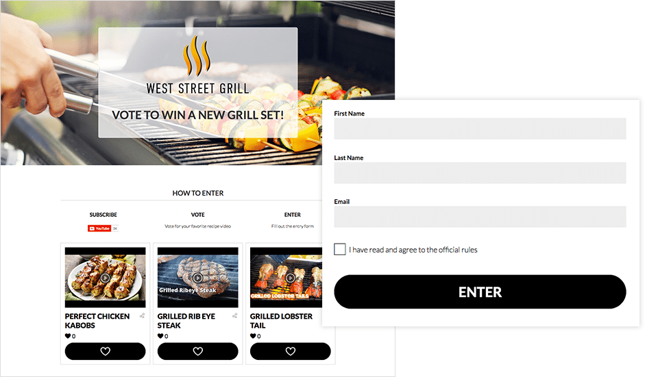 Let your fans decide what they like best. Display two or three different videos and have your users vote on their favorite. Before they can vote, they have to fill out your form. Here’s how you’d set it up.In this example, you own a restaurant and you’re giving away a huge haul of BBQ tools in honor of an upcoming event -- let’s say, the 4th of July. You create a video announcing the giveaway and direct people to your landing page where they can watch three quick how-to videos showing off different grilling recipes. Then they get to vote on their favorite of your three recipes. BUT, before they can vote and get a chance to win, you require them to fill out a form, sharing their best email address with you.