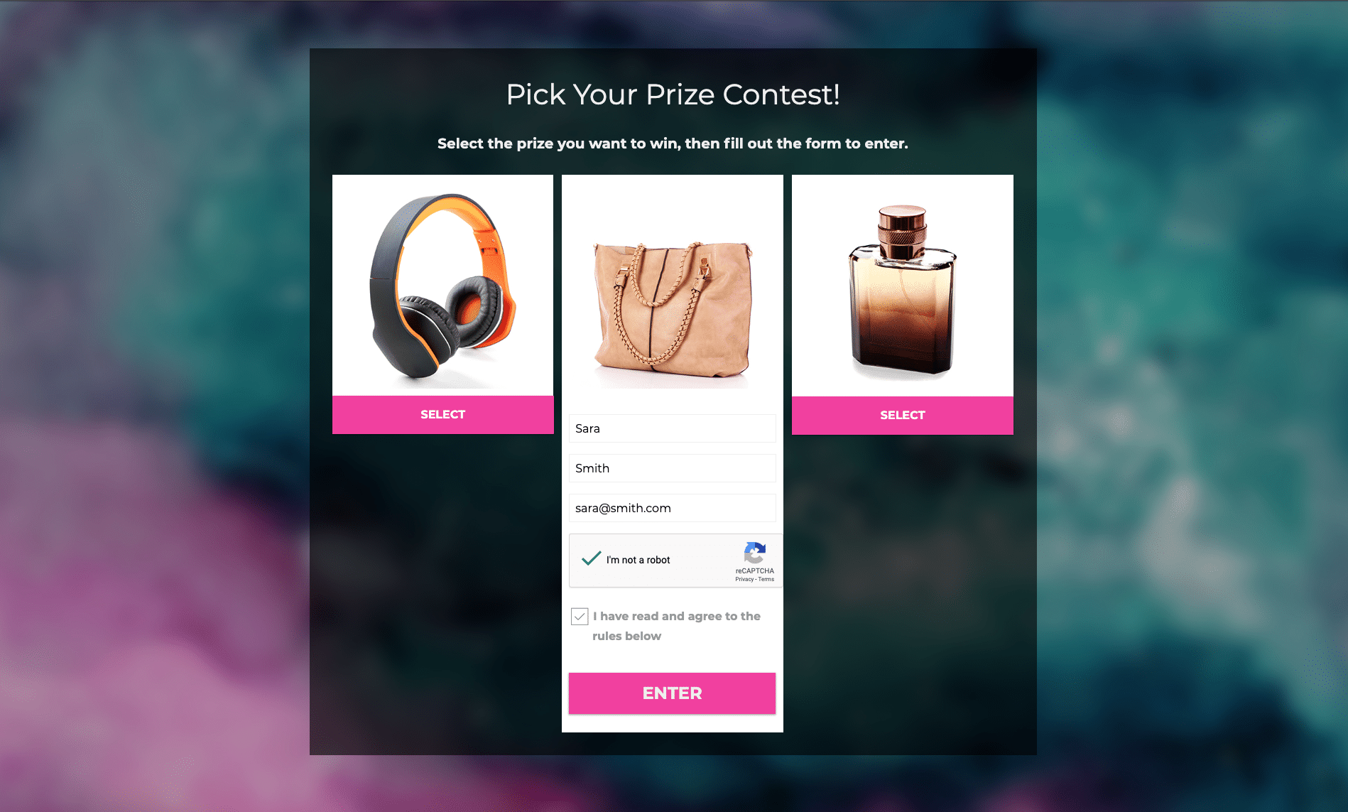 Offer a smaller prize in your Timeline contest, but then use another, more valuable prize as an incentive for submission via your entry form. As a bonus, let participants choose the prize they’d like to win. In this Pick Your Prize contest, the participant can select between three (or more) prizes when entering to win. As a bonus for you, use the participant’s prize selection as data to help you further segment your email list. For example, those that chose to win the designer bag will get an email when your purses are on sale down the road.