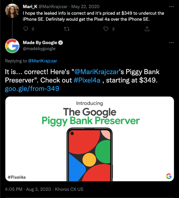 Twitter is most known for its minute-by-minute breaking news and access to the rapid-fire opinions of the best and brightest around, but 93% of Twitter users also follow brands they plan to buy from. For new product releases, sale updates, and other quick blurbs about your brand, Twitter is a great platform. Twitter users know they won’t get full-length reviews on products, but they still have the opportunity to get a first look and peeks about what other goodies are to come. For example, when Google launched their Pixel 4a phone in 2020, they went to Twitter. What set their campaign apart? They personalized each response they made to every person with images and links using the customer’s name to gain engagement. Personally, if Google responded to my comment with personalized content, I would share the cool experience with my friends and family and maybe even buy the product.