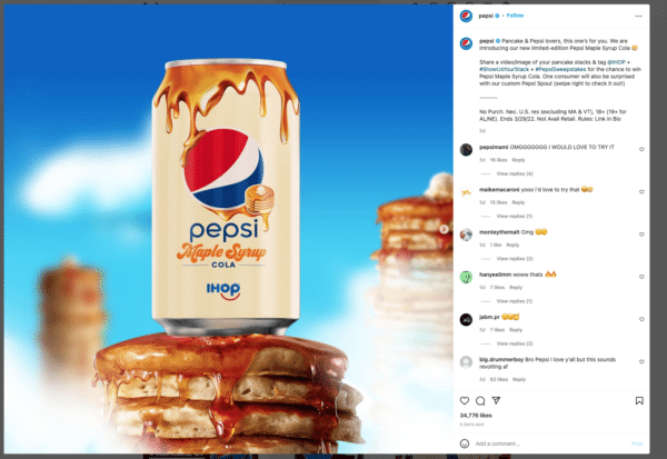 Instagram is a major player in eCommerce sales, with 44% of Instagram users utilizing the platform to shop weekly. Notably, for WOM, one in two Instagram users have found a new brand on the app. This willingness by Instagram users to find new products and services via the platform is fantastic news for furthering your brand awareness through Instagram. For example, check out how Pepsi is taking the (pan)cake with this hashtag contest showing off their new peculiar flavor: Maple Syrup Cola.