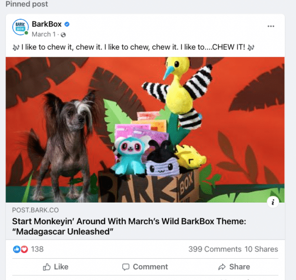 While Facebook is not the most popular social media channel amongst Gen Z, it still performs as the most used social media platform with 1.9 billion daily users. Depending on your audience, it would be unwise to forget about using Facebook for your marketing campaigns. BarkBox is a well-known eCommerce platform with a strong Facebook presence. What makes them stand out from the crowd is their strong community presence. They have 2.9 million followers on Facebook and have daily interactions with their followers. The first thing a user sees when they view the BarkBox Facebook page is a pinned post about their March Box. That post has almost 400 comments, many of which are their customers' rave reviews. (Confession: As a pet owner, I now want to pay for a BarkBox subscription!)