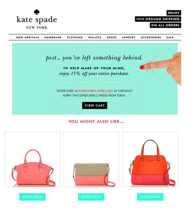 Even on your best day, not everyone who enters the funnel will come out the other end as a customer. Otherwise, we’d call it a conversion tube. No matter how many people went from follower to customer through the steps in your funnel, there’s still more work to be done. Use your beefed-up email list and keep the conversation going by sending coupons, discounts, news, and invitations to participate in future giveaways.You can segment your marketing to make your email campaigns a more personalized experience. You can even trigger automated email campaigns to retarget those who have interacted with your business in some way. I know I’m a sucker for those pesky abandoned cart emails - reminding me of that gorgeous bag I thought I had the willpower to walk away from. With an additional 15% off, who can resist?