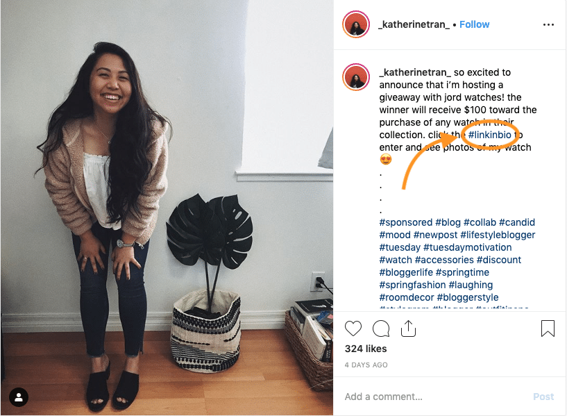 On Instagram, you’re only given one live link to use in the bio section of your profile. Direct traffic from your posts to your bio by saying “link in bio.”